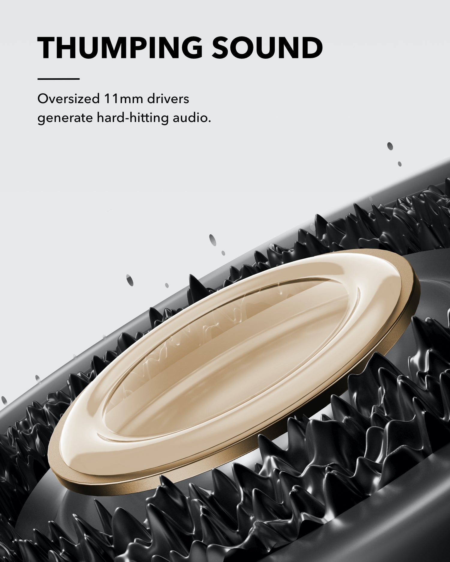 - Thumping Sound: An oversized 11mm bio-composite driver generates 50% more bass. Get ear bouncing beats without sacrificing clarity and treble.
