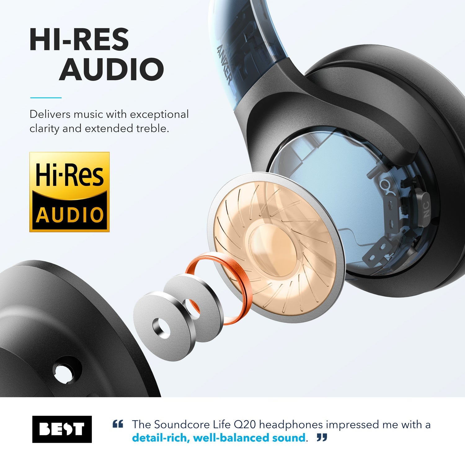 - Hi-Res Audio Certified: Custom oversized 40 mm dynamic drivers produce Hi-Res Audio—a certification only awarded to audio devices capable of producing exceptional sound. Life Q20 active noise cancelling headphones reproduce your music with extended high frequencies that reach up to 40 kHz for extraordinary clarity and detail.